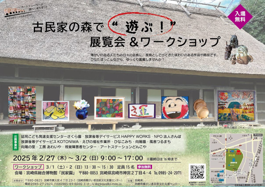| 申し込み・お問合せ | 宮崎県障がい者芸術文化支援センター 住所:宮崎県宮崎市東大宮4丁目23-1 (アートステーションどんこや内) 電話:0985-27-2823 メール:donkoya@jl.moo.jp または donkoyart2019miyazaki@gmail.com |