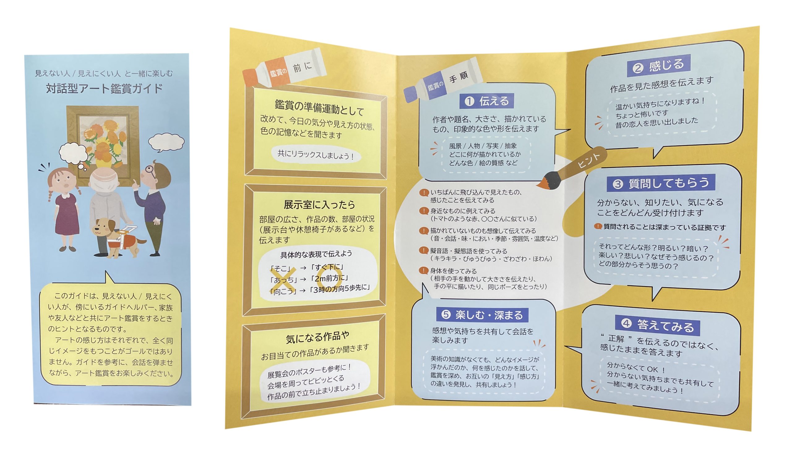 このガイドは、見えない人/見えにくい人が、傍にいるガイドヘルパー、家族の人や友人などと共にアート鑑賞をするときのヒントとなるものです。